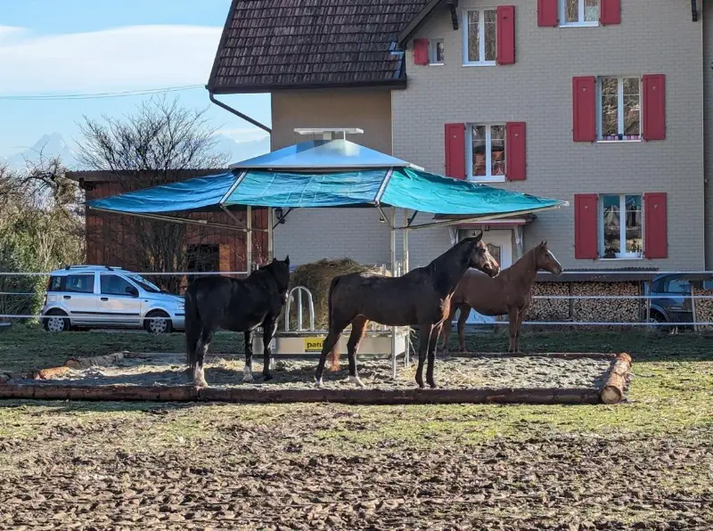 Buffet mit Bio Heu ohne Netz, welches in einer überdachten Raufe offeriert wird. Und falls wir wieder etwas arbeiten möchten, haben wir einen kleinen Rasenplatz vor Ort oder können nach Längendorf und einen Sandplatz / Reithalle mieten mit Material. Was uns besonders Spass macht ist jedoch das abwechslungsreiche Gelände, welches zum Spazieren und Ausreiten lockt.