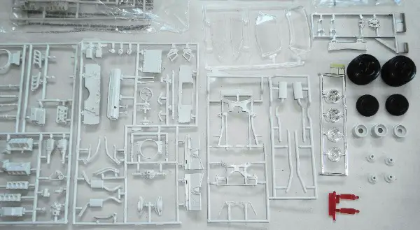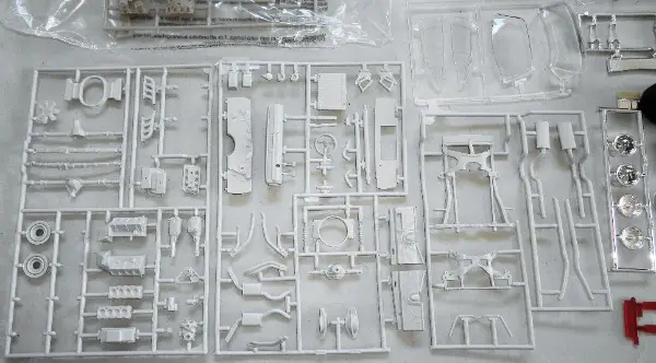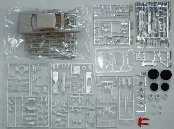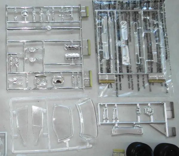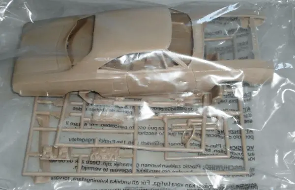 Der Bausatz ist von 1992, offen, wenige Teile sind lose, 1 innere Felgenhälfte vorne fehlt, 1 Chromgiessast ist noch verschweisst, der Karton weist Gebrauchsspuren auf.