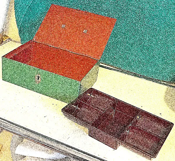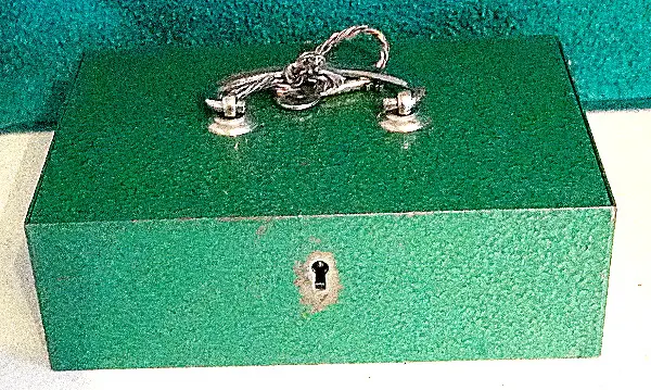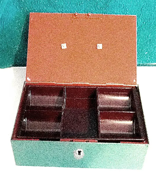 Es ist eine metallerne Geldkassette mit herausnehmbarer Münzeinsatz. Masse: 20cm / 14cm / 7cm.