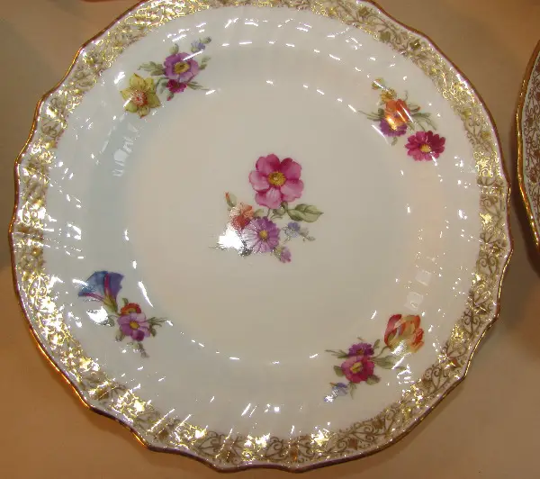 Dekor: Polychrome Blumenbouquetmalerei, Fahne Korbrand reliefiert mit handbemaltem Goldrand