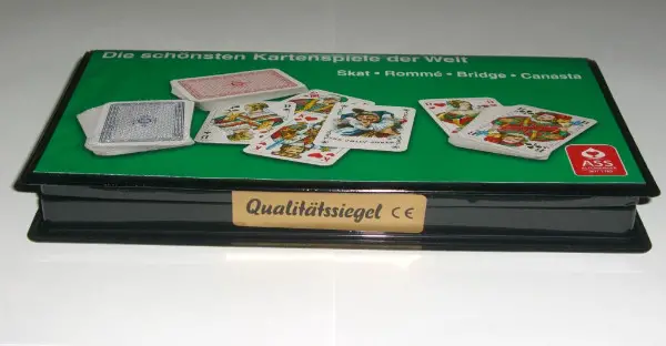 Ob Rommé, Skat, Bridge oder Canasta, Poker, Black Jack oder Mau Mau – mit dieser praktischen Spielkartenkassette im Folienetui können die schönsten und beliebtesten Kartenspiele der Welt gespielt werden.