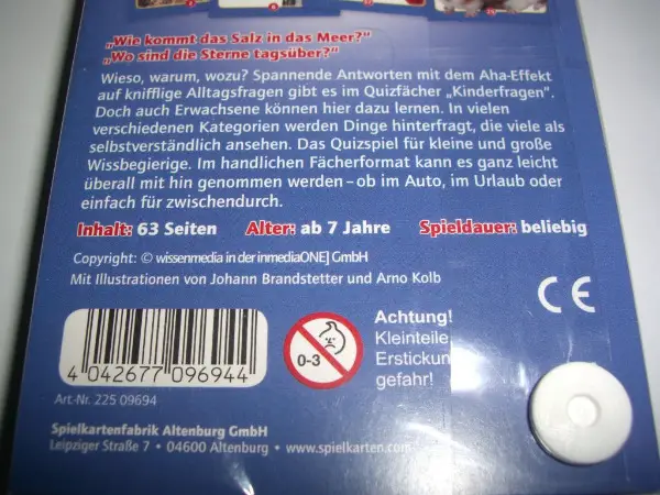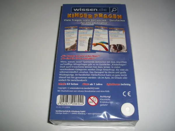 Quizfächer "Kinder fragen..." Wieso, weshalb, wozu? Das Quizspiel rund um Themen, die Kinder bewegen Wie kommt das Salz ins Meer? Wo sind eigentlich die Sterne tagsüber? Kinder wollen jeden Tag etwas Neues wissen - doch auch Erwachsene können hier noch dazu lernen. Über 170 spannende Antworten mit dem Aha-Effekt auf knifflige Alltagsfragen gibt es im Quizfächer "Kinder fragen". In vielen verschiedenen Kategorien werden Dinge hinterfragt, die viele als selbstverständlich ansehen - warum das aber so ist und nicht anders, das wissen manchmal die wenigsten. Bis zu drei verschiedene Antwortmöglichkeiten pro Frage und sehr ausführliche Antworten mit vielen wissenswerten Details machen den Quizfächer zum spannenden Wissenstest und Wissensgeber. Im praktischen und handlichen Fächerformat kann das Quizspiel jederzeit und überall gespielt werden, ob im