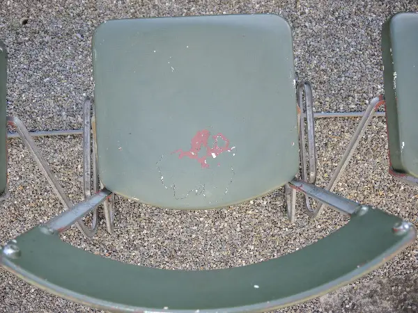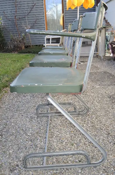Stuhl. 2 Stühle mit Armlehnen. Praktisch kein Rost, grüne Farbe (evt. nicht original) mit Abplatzer. Hier kommt wahrs. verzinktes Metall zum Vorschein. Zum Brauchen oder zum Auffrischen. Der Hingucker im
