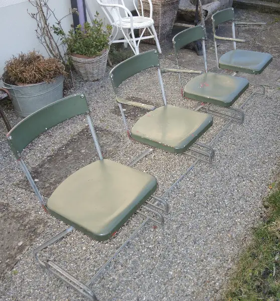 4 antike Gartenstühle wahrs. 50 er Jahre. Ungewöhnliches Design mit leichter Federfunktion. Stapelbar. Sehr schwer, ca. 8 kg pro