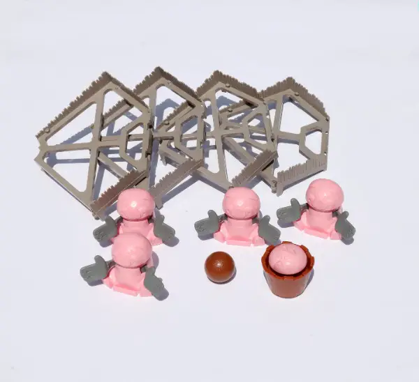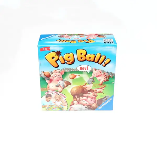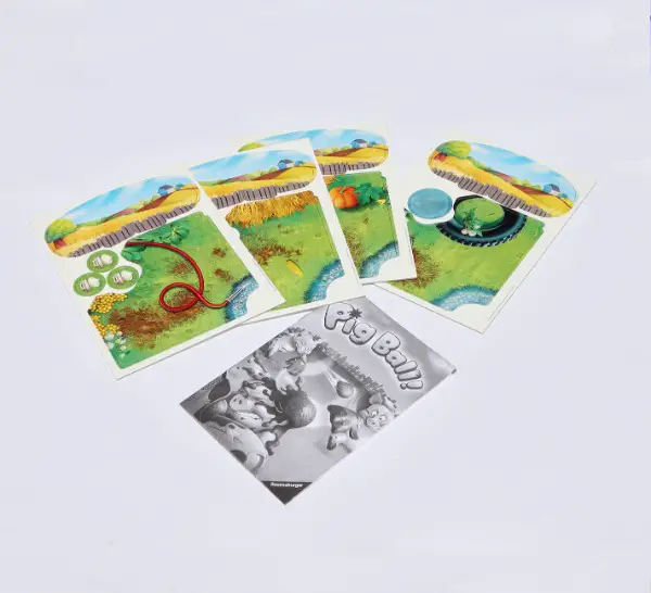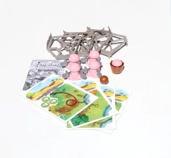 Zaun, 1 Spielfeld (bestehend aus 4 Teilen) , 4 Seitenbegrenzungen, 4 Ferkel, 1 Timer, Muttersau, 1 Matchball, 9 Watch-dich Chips, 1 Pfütze,