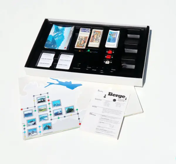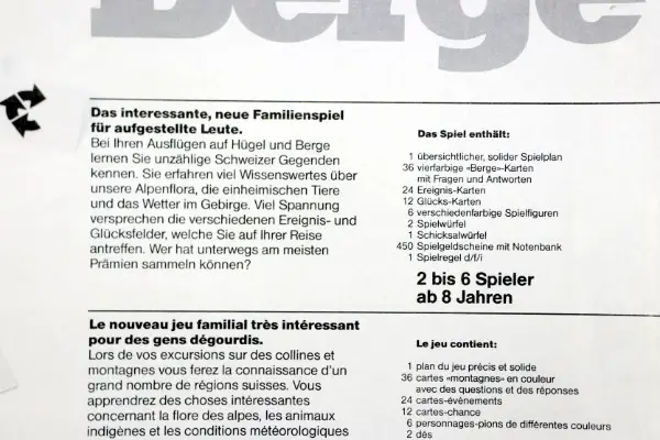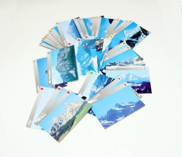 1 Spielbrett, 36 vierfarbige Berge Karten mit Fragen & Antworten, 24 Ereignis Karten, 12 Glücks Karten, 6 verschiedene