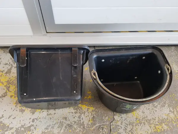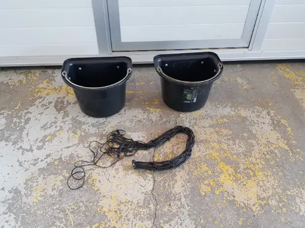 Zum Verkauf stehen zwei Futterkrippen für den Gebrauch im Pferdeanhänger und/oder auf dem Turnierplatz. Die Futterkübel sind sehr gut erhalten und können sofort eingesetzt werden. Die stammen von einem Böckmann Pferdeanhänger. Sie können indes auch bei anderen Modellen (z.B. Humbaur Xanthos Aero etc.) eingesetzt werden. Nachstehend die Dimensionen: