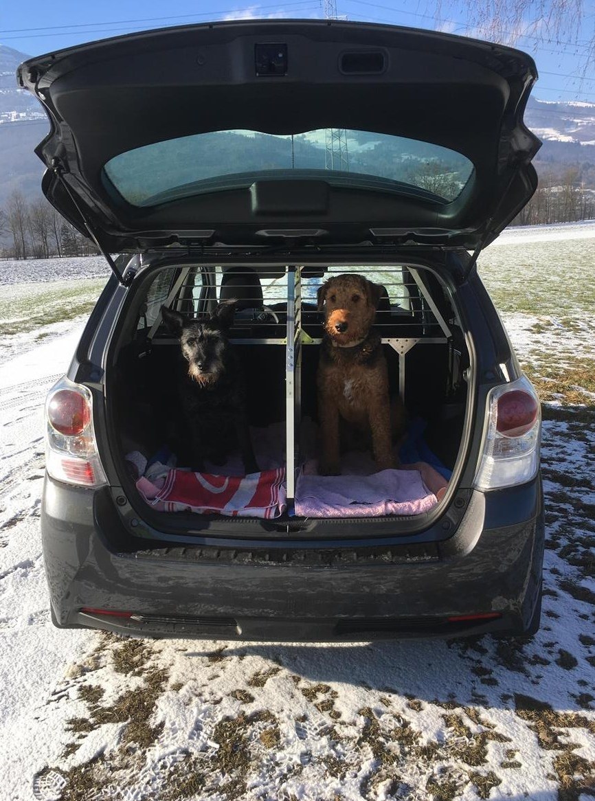 Dieses Schutzgitter ist eine Massanfertigung für Toyota Verso ab Jg 2017. Wie auf einem Foto zu sehen ist, wird es an drei Punkten an der unteren Verbauung befestigt. Der Notausstieg bei einem Heckschaden erfolgt über die Rückbank. Der Hund hat grosse Freiheit in der Höhe und Länge und fühlt sich nicht eingeengt. Trotzdem ist der Transport für alle sicher.