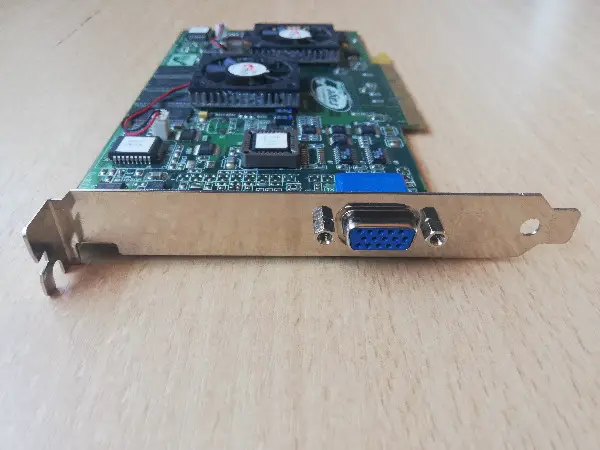 Die ATI Rage Fury Maxx ist ein seltenes Ausstellungsstück mit VGA-Port und zwei winzigen Lüftern auf der ansonsten nackt erscheinenden Platine. Das Besondere: Auf einer Platine wurden zwei Rage-128-Pro-GPUs vereint. Dieser Dual-GPU-Ansatz war damals eine Neuheit und wurde in den 2000er-Jahren zu einem wichtigen Verkaufsargument im Gaming-Bereich.