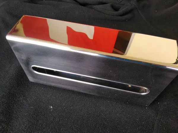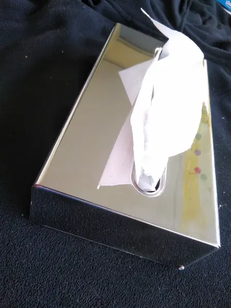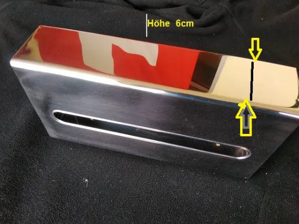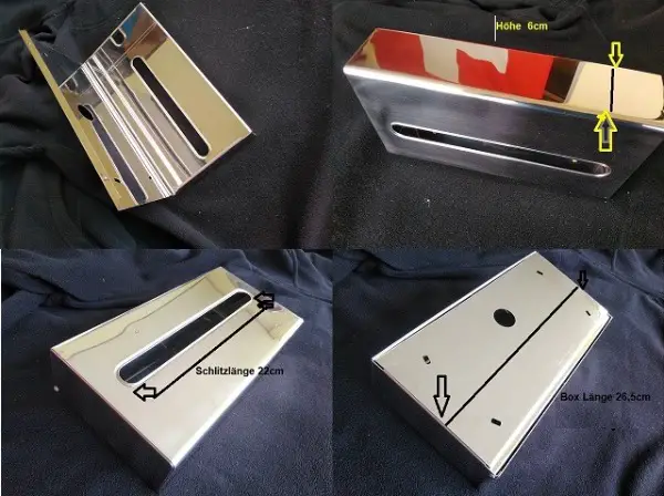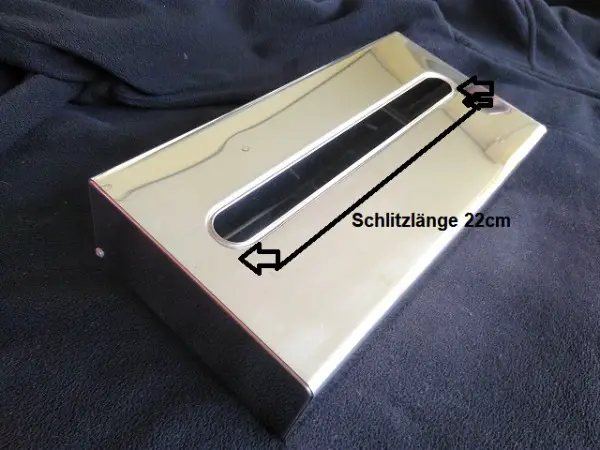 Occasion Kosmetiktuchspender aus Edelstahl Chrom.Kann als Aufstellbox oder als Wandmodell benutzt werden.Länge 26,5cm. Breite 14cm.Höhe 6cm.Schlitzlänge 22cm. Abholung vor Ort möglich.Vorkasse.Versand möglich.