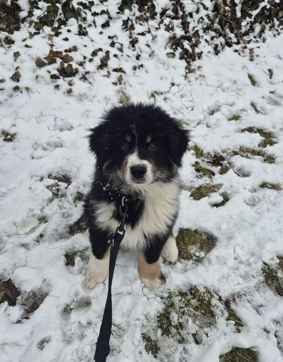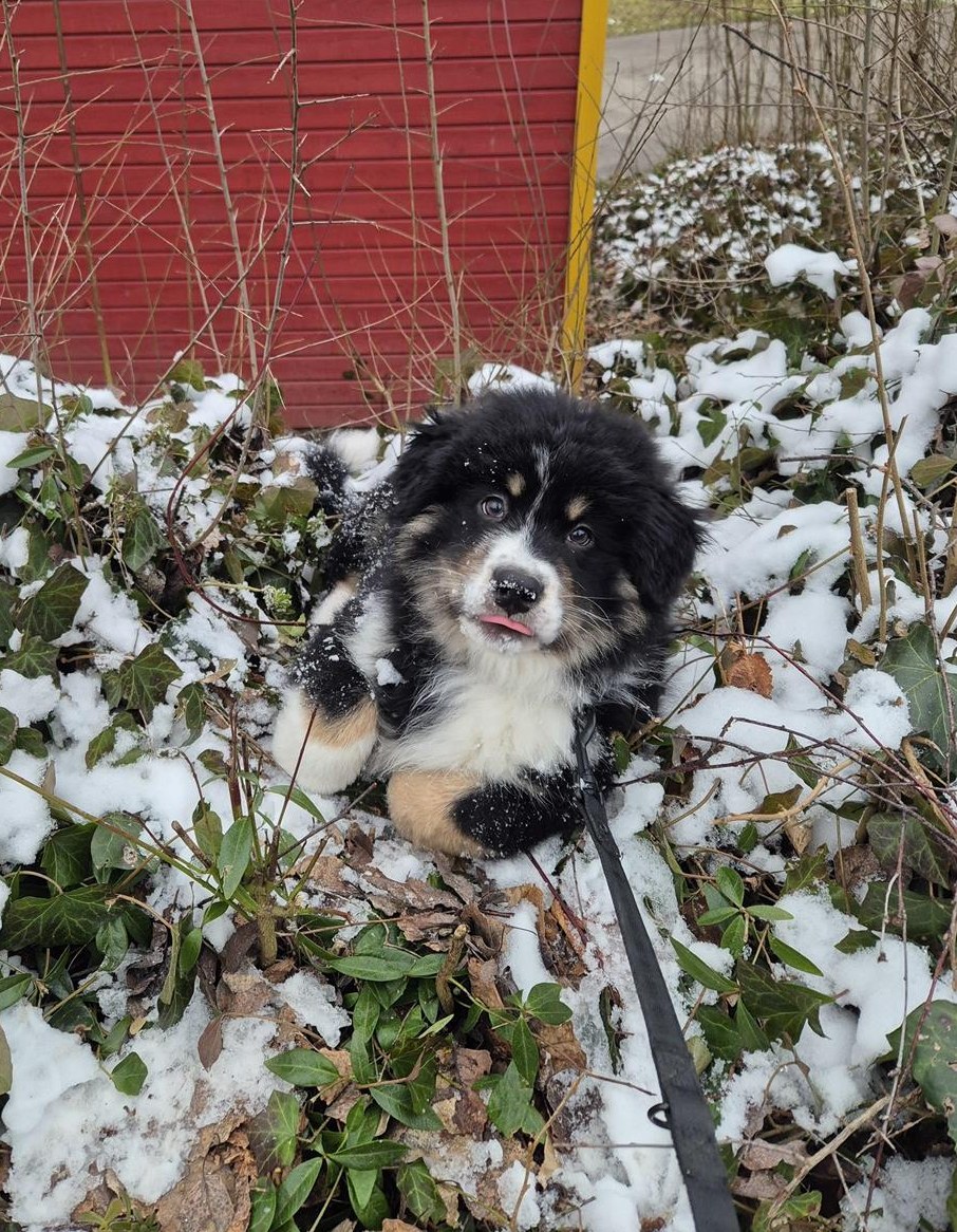 Der kleine Welpe ist ein Leonberger x Sennenhund mix.