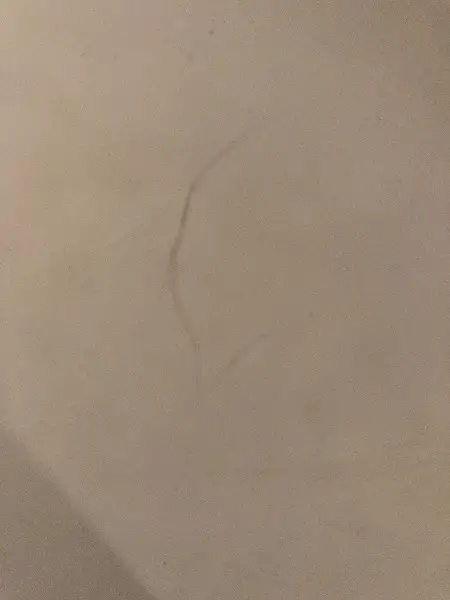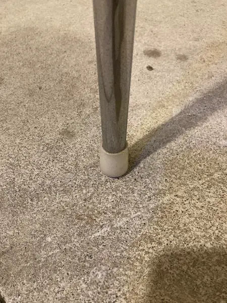 Die Tischplatte hat ein paar Kratzer und Flecken, auf den Tischbeinen ist Rost.