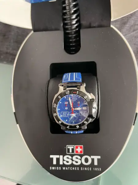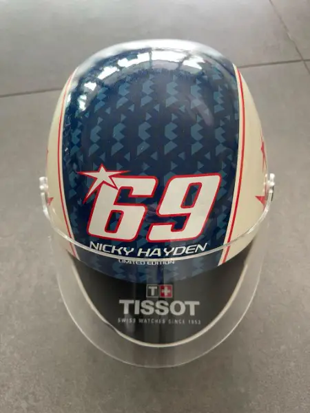 Nicky Hayden ist ein amerikanischer Motorradrennfahrer. Seine Glückszahl 69 mit dem Sternlogo wird auf der Unterseite der Uhr platziert, und Rot und Schwarz sind „Seiner Farben“. Die Tissot T-Race Nicky Hayden Uhr wird in einer