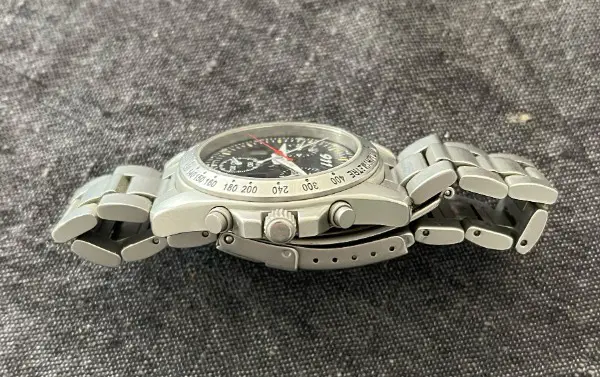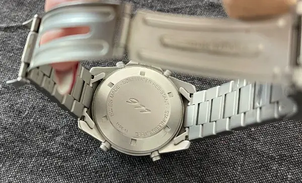 Das Edelstahlgehäuse verfügt über eine verschraubte Krone, ist bis 50 Meter wasserdicht, hat einen verschraubten Gehäuseboden, eine Chronographengenauigkeit von 1/100 Sekunde und vier Funktionstasten. Das schwarze Zifferblatt enthält zwei LCD-Fenster für Zeit- und Datumsfunktionen, Minuten- und Stundenzeiger, einen 1/100-Sekunden-Zeiger, einen Chrono-Sekundenzeiger, einen 30-Minuten-Zähler und einen 12-Stunden-Zähler. Das