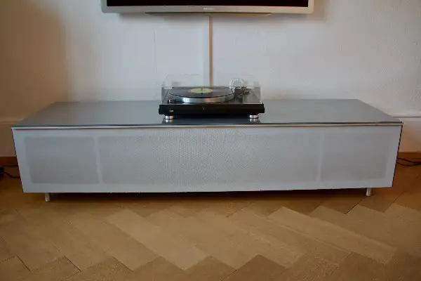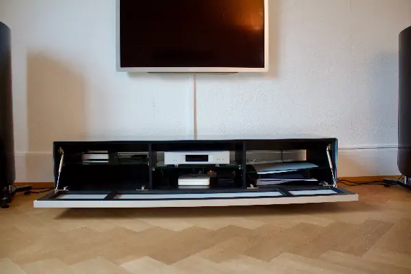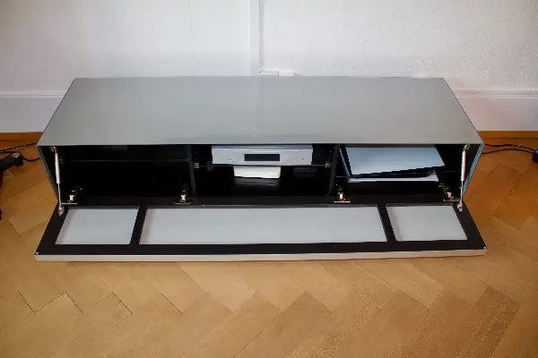 • Durchgehende Frontklappe aus blickdichtem Akustik-Stoff (Farbe Silber) , damit bei Soundbars die Akustik nicht beeinträchtigt wird und eine gute Belüftung der Geräte garantiert ist.