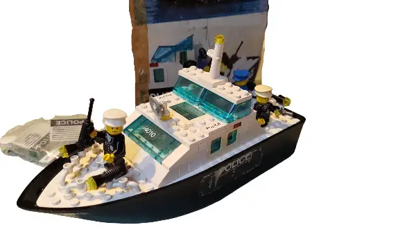 Es fehlen ein paar Teile und die Orignalschachtel aber ich habe die Aufbauten des Polizeiboots mit eigenen weissen Teilen verstärkt und noch eine blaue Kabitänsfigur dazu gelegt. Es ist alles dabei was auf den Bildern zusehen ist.