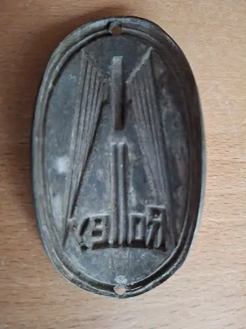Markenschild 1945. Material Guss. Lochabstand Mittig gemessen 60 mm. Höhe 65 mm. Breite 32 mm. Gebogene Höhe 19 mm. Sehr schön.