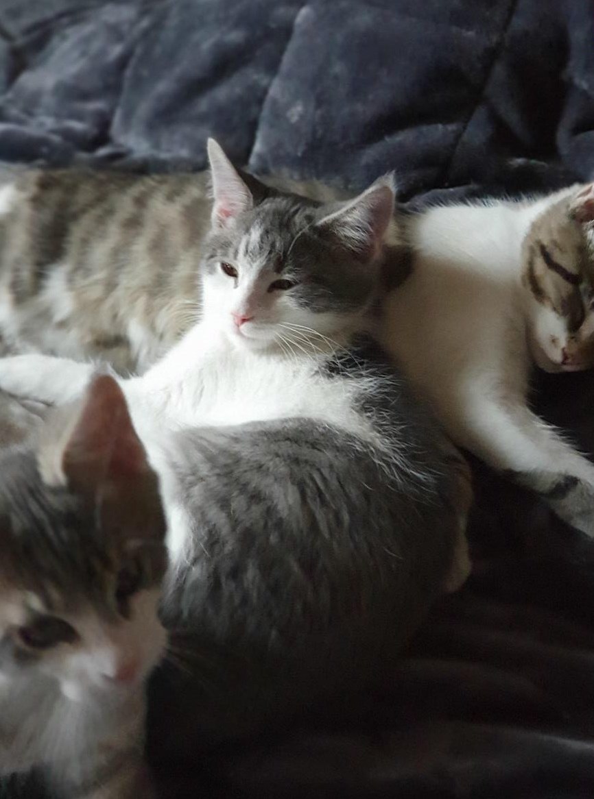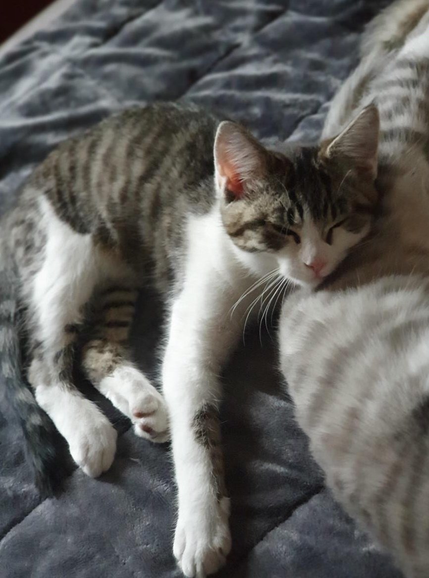 Büsi Geschwister auf, wie sie einander putzen und aneinander gekuschelt einschlafen.