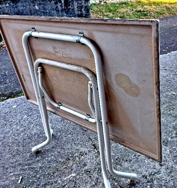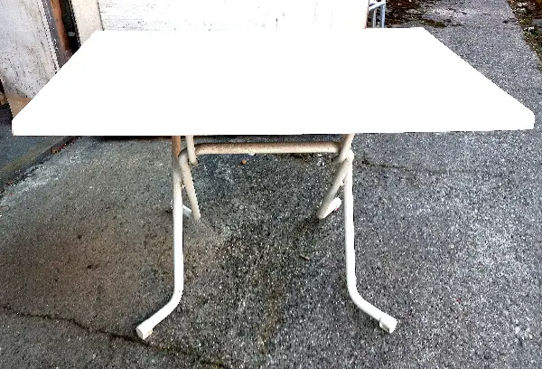 Es ist ein guter, praktischer Gartentisch mit Stahlbeinen und einer Kunststoffplatte, Masse: 100cm X 70cm, Höhe 73cm. Natürlich ist der Tisch einfach klappbar und kann gut platzsparend aufbewart werden.
