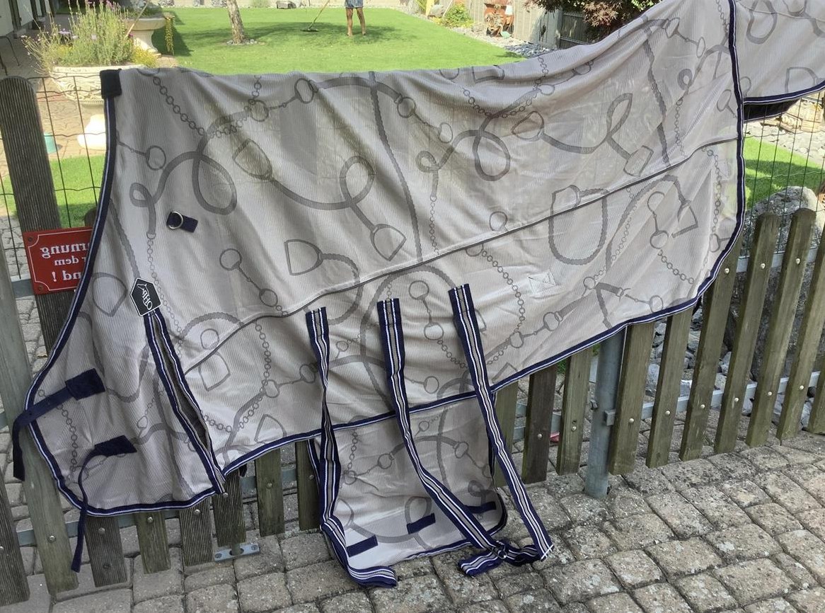 Fliegendecke mit Bauchlatz und separatem Halsteil und Gehfalte, von QHP in der Grösse 135cm in Originalverpackung, bei Versand zuzüglich Porto.