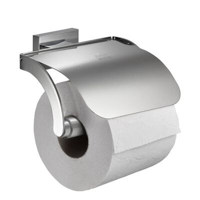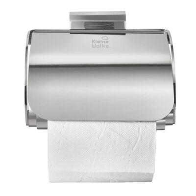Toilettenpapier einsatzbereit halten, ohne Ihre Badezimmerwände mit Löchern zu ruinieren? Dann bietet dieser silberne Meo Rollenhalter mit Deckel von Kleine Wolke dank seiner einzigartigen Halterung die perfekte Lösung!