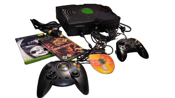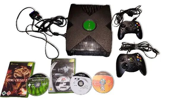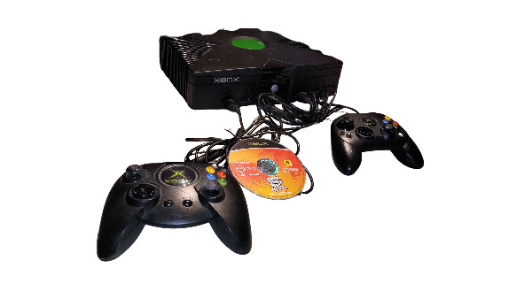 Xbox der ersten Generation in klassischem Schwarz. Die Konsole kommt mit zwei Controllern, Stromkabel, AV-Kabel sowie 3 Spielen. Perfekt für