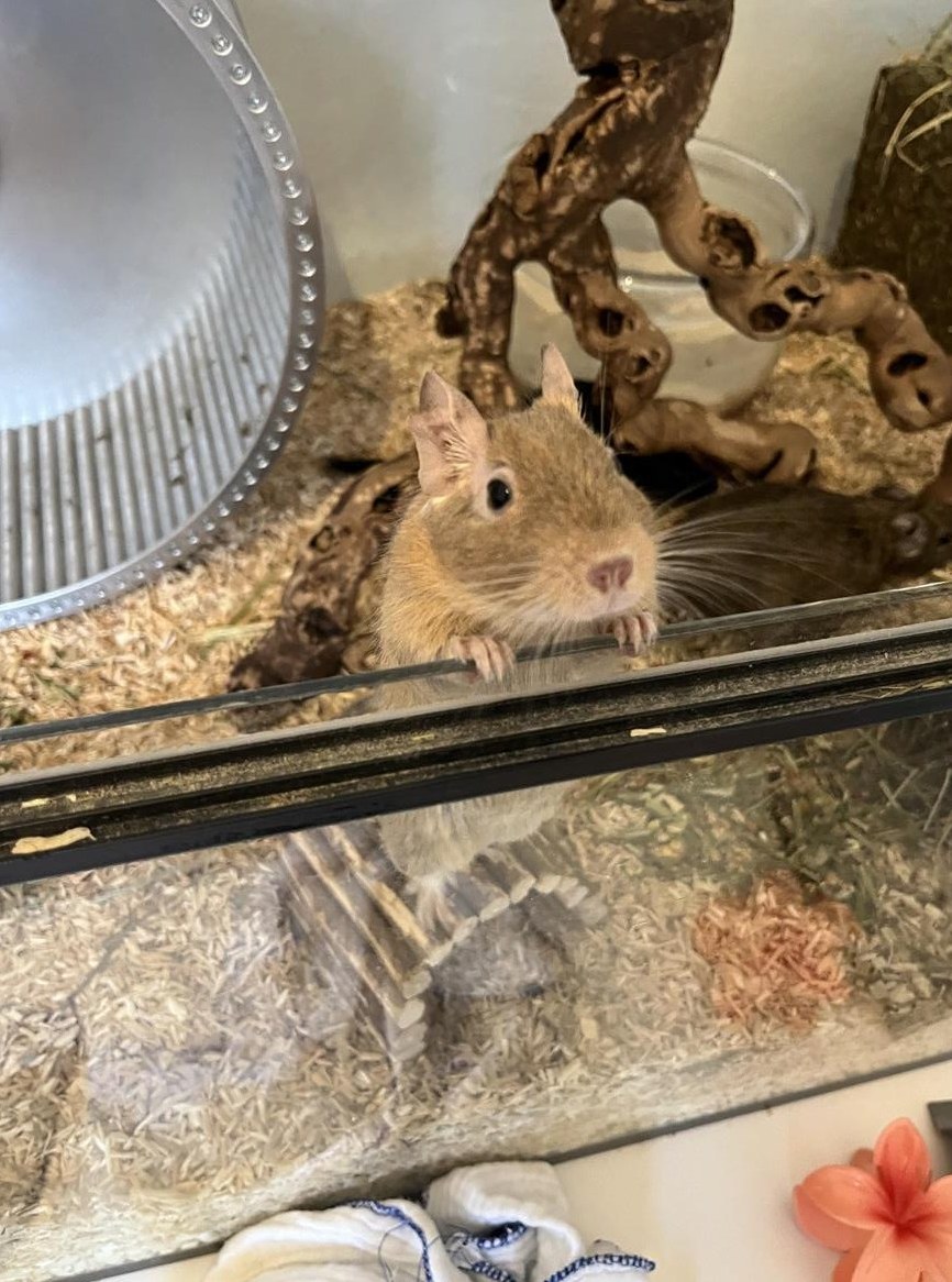 Degu Männchen inkl. Glaskäfig, Alulaufrad, Futter und Zubehör