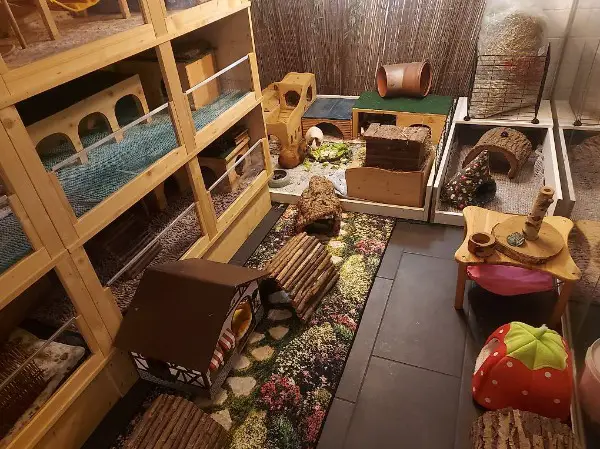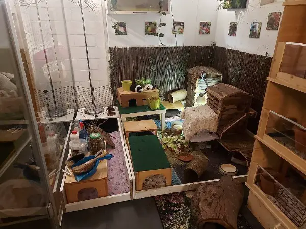 Bei mir können 4 Gruppen gleichzeitig betreut werden, das Feriengehege ist auf dem Foto in der Mitte ersichtlich. Es ist 220cm lang und 60cm breit. Eine Grossgruppe bis max. 8 Meerschweinchen ist möglich, die unteren beiden Stockwerke lassen sich verbinden. Das kostet dann 20.- pro Tag und Gruppe.