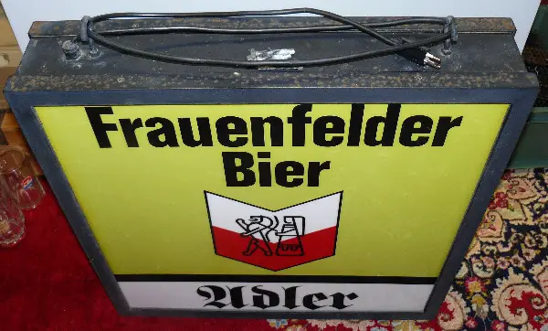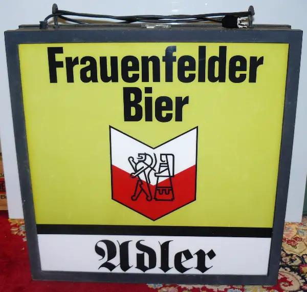 Gebrauchte Leuchtreklame "Frauenfelder Bier, Adler" mit Eisenhalterung für Deckenmontage. Die Reklame ist funktionstüchtig und ein echter Hingucker. Sie weist altersbedingte Gebrauchsspuren auf. Ideal für Sammler oder als