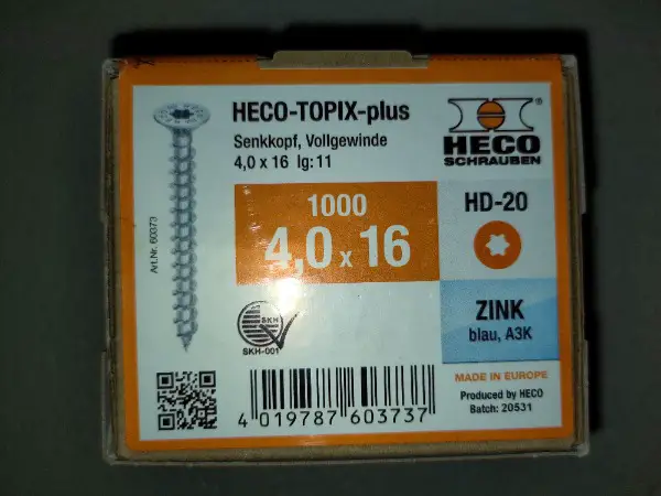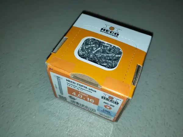 4.0 x 35 Pkg. 500 Stk., Preis pro Pkg. - bis 4 Pkg vorhanden. HECO-Topix-plus Schrauben 4.0 x 16 Pkg 1’000 Stk., Preis pro Pkg. - bis 4 Pkg vorhanden.