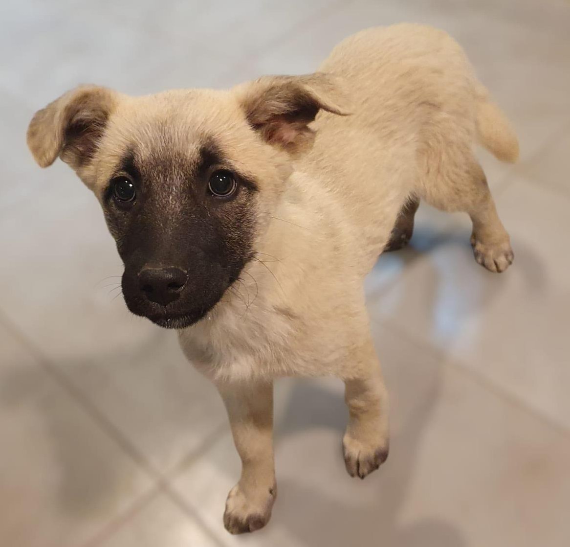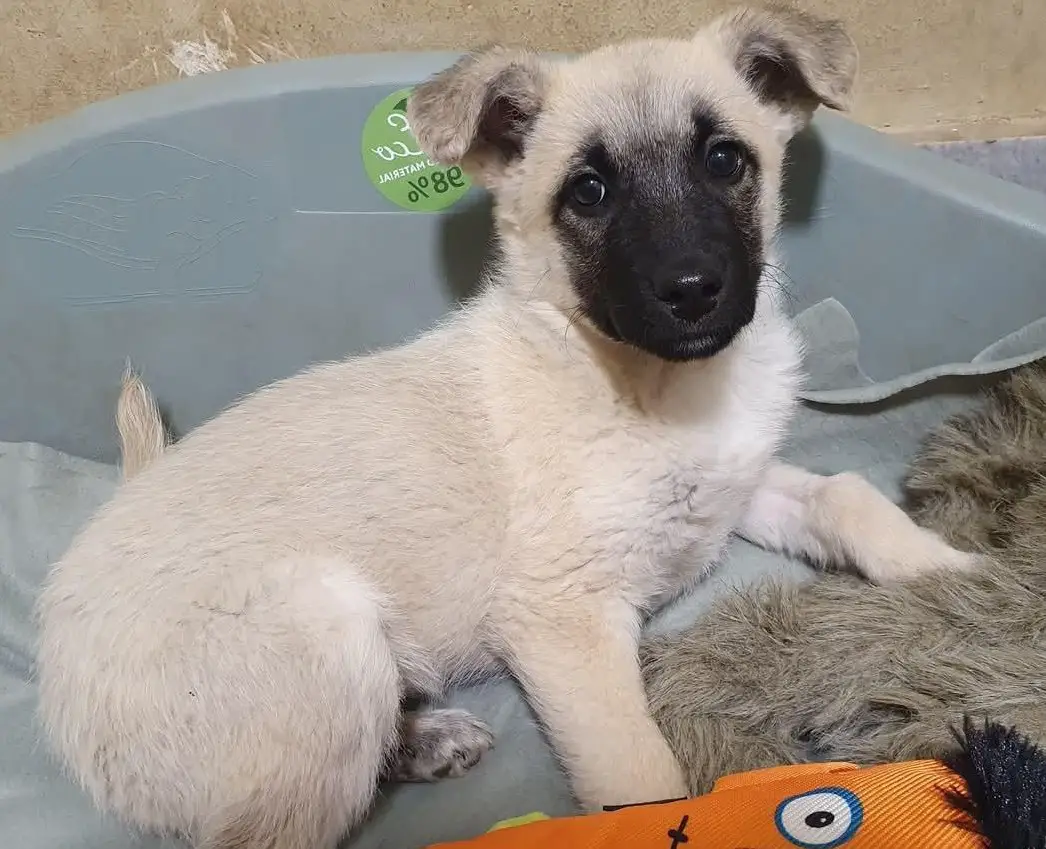 Hündin hat sich sehr schnell den anderen Hunden in unserem Tierheim angeschlossen und spielt gerne mit ihnen. Wir kennen ihre Eltern nicht, aber wir vermuten, dass sie von durchschnittlicher Grösse sein wird. Wir vermuten ein