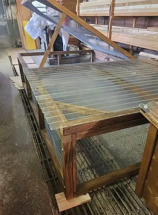 Gitter. Gehege 1/2 mit Kunststoffwellblech gedeckt, 2 Deckel zum Aufklappen, Casanet-Gitter rostfrei + bissfest. Beides mit Riegel, abschliessbar.