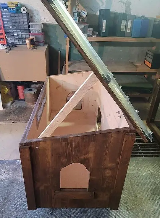 Schichtplatte Fichte 30 mm / Auslauf Doppellatten) , Farbe Dunkelbraun, Boden Stall isoliert, mit Verbindungsröhre ins Gehege, Boden mit Novilon ausgekleidet, 2 Fenster