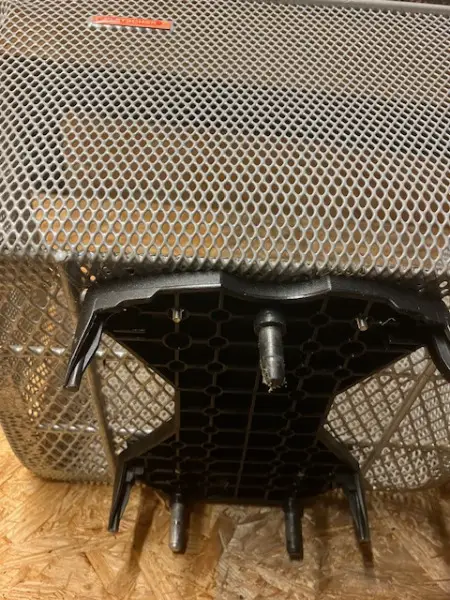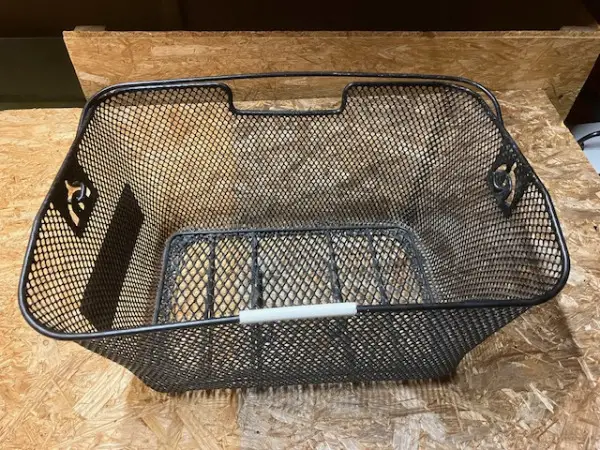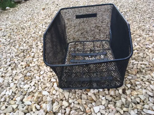 b) 1 Stk. Marke "Pletscher", Masse 43 x 31 cm, H=26 cm, vorn Rand 7 cm tiefer, gebraucht, mit einer Grund- Platte unten am Korb und Dornen (Foto 2+3, hier ist auch passender Gepäckträger da (mit den Passlöchern) , dieser Packträger zu Fr. 14.-, sep. von Korb (Packträger + passender Korb also = 27.-)