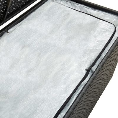 Aufbewahrungsbox besteht aus pulverbeschichtetem Stahl und handgeflochtenem Poly Rattan, das langlebig, rost- und witterungsbeständig ist und dadurch eine jahrelange Lebensdauer gewährleistet. Sie lässt sich auch leicht mit einem feuchten