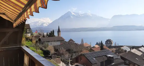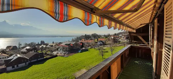 Sonnige Hanglage mit atemberaubender freier Sicht auf Thunersee und Berge.