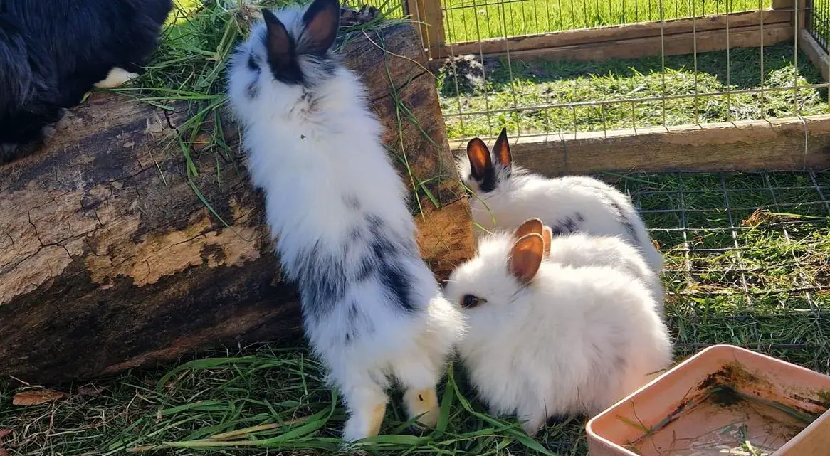 Es hat: zwei schwarzweisse Weibchen, ein schwarzweisses Männchen, ein rotschwarzes Männchen und ein braunweisses Männchen. Die Zwergkaninchen sind an Gras gewöhnt!