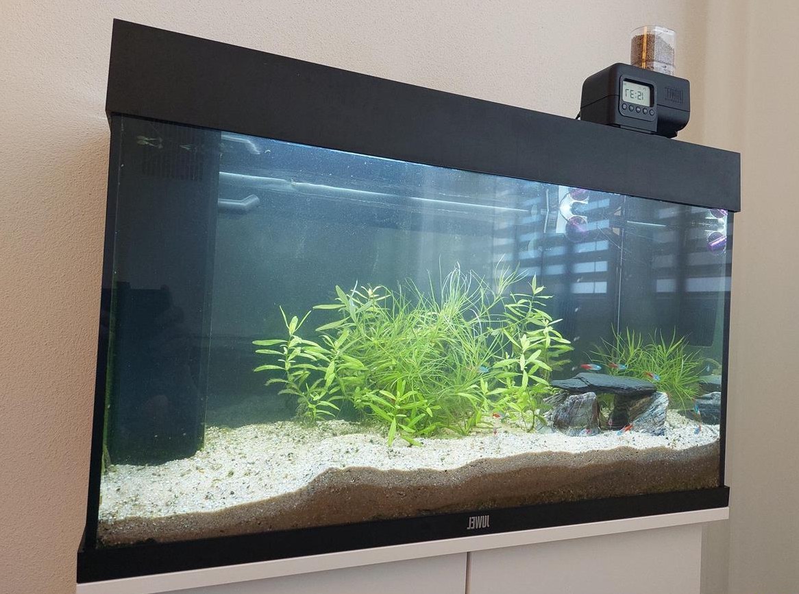 Es ist viel Zubehör dabei, u.a. Futterautomat von Juwel, digitales Thermometer von Juwel, zweiter Filter mit UV-Licht, Futter etc.
