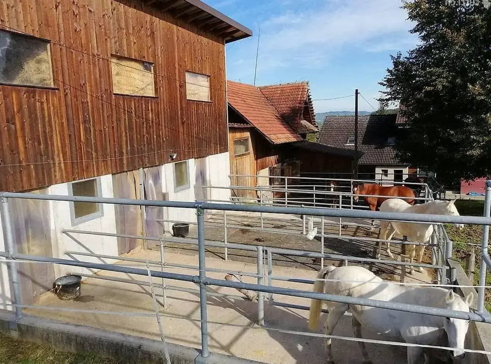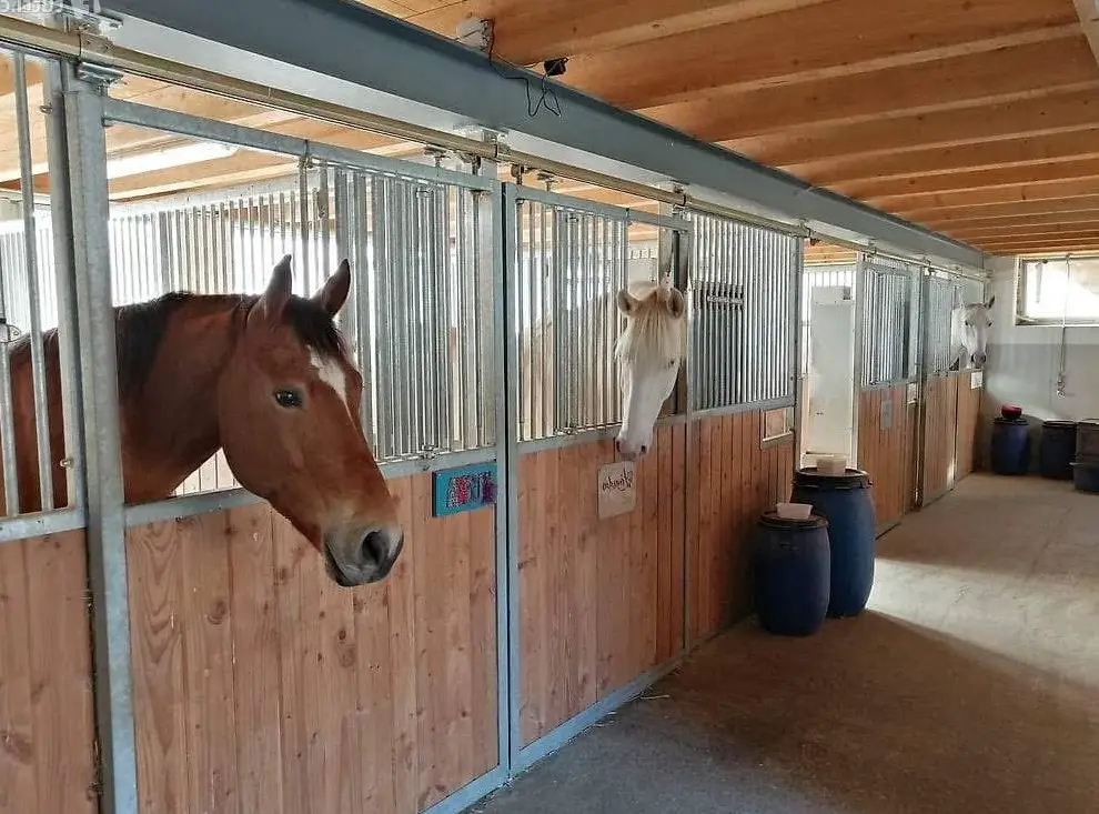 Der Stall beinhaltet fünf helle und schöne Auslaufpferdeboxen und drei Auslauf-Gruppenhaltungen. Es ist ein Sandviereck, Waschplatz, Putzplatz,