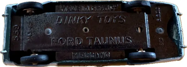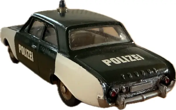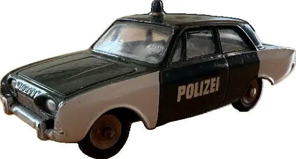 Der Ford Taunus Polizei Wagen ist aus Gusseisen von bester Qualität gegossen und filigran und sehr detailreich hergestellt. Er wurde in einem DINKY TOYS – Meccano Werk in France hergestellt und für den deutschen Markt produziert.