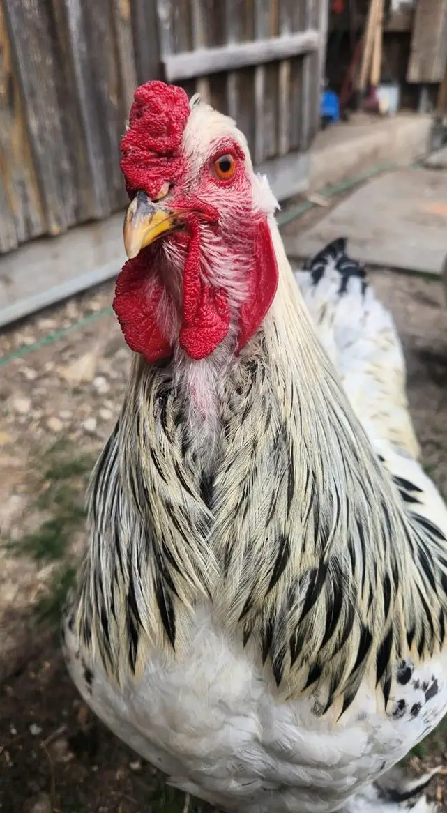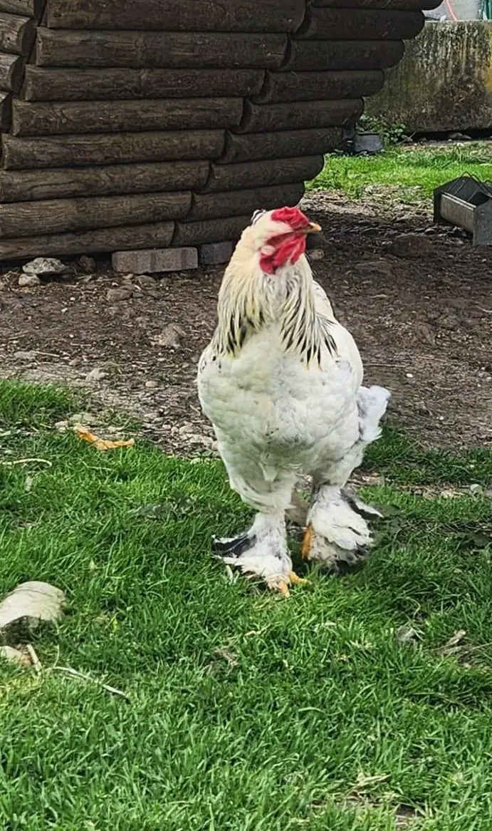 -Hahn, geboren im September 2024. Der Columbia Brahma Hahn wird nur an einen guten Lebensplatz mit eigener Hühnerschar abgegeben. Weitere Infos zum Hahn auf Anfrage.