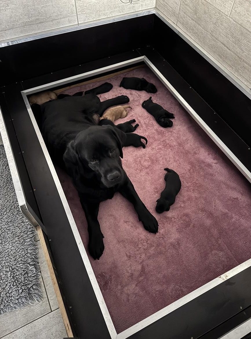 Labrador Retriever Welpen zur Welt gebracht - fünf Rüden und vier Hündinnen. Die kleinen Welpen sind eine bezaubernde Mischung aus tiefem Schwarz und hellem Foxred: vier schwarze Rüden, drei schwarze Hündinnen sowie je ein Foxred-