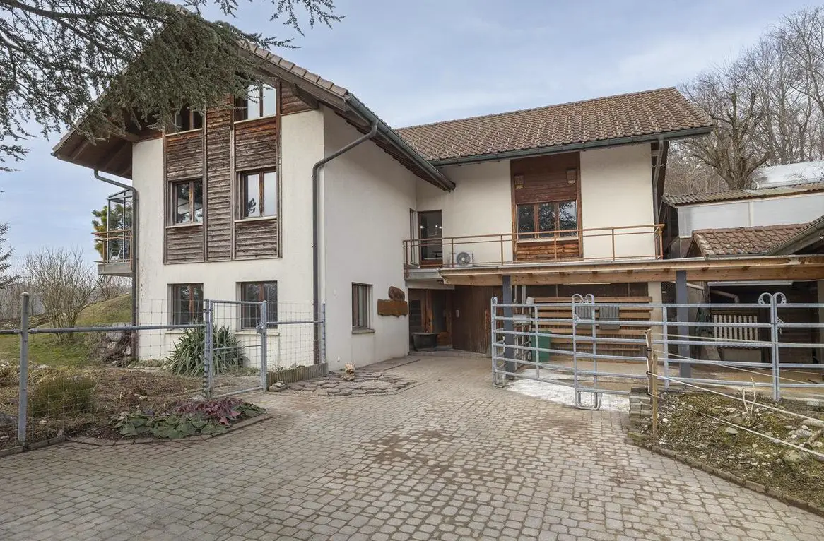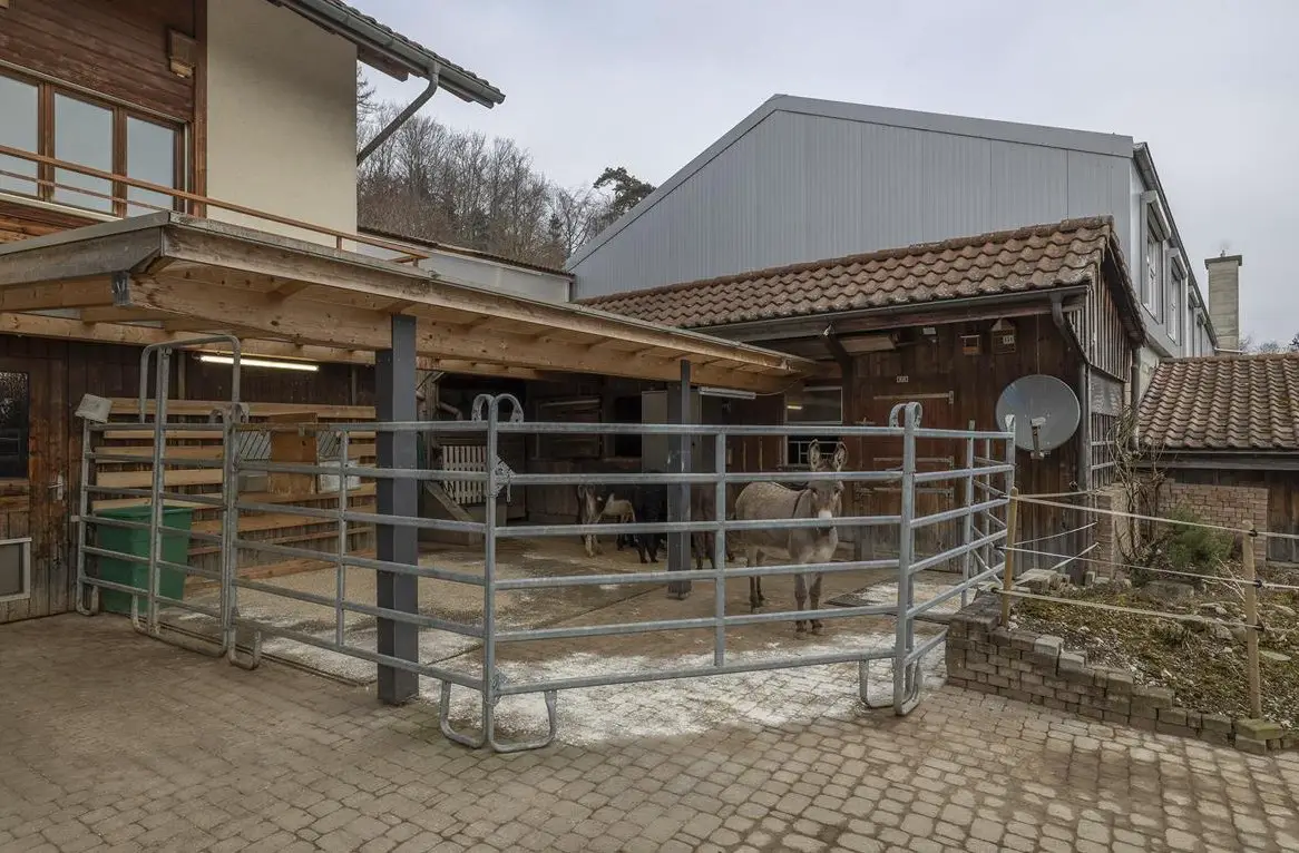 Pferdestall mit einer Doppel- und einer Einzelbox konzipiert. Ein zusätzliches, einseitig offenes Nebengebäude diente als Futterlager. Die Anlage wird aktuell zur Haltung von Eseln und Alpakas genutzt. Ein Teil der östlichen Parzelle ist fest umzäunt und dient als zusätzlicher Auslauf/Weide. Er kann nach Absprache mit dem Eigentümer bis 650 m² vergrössert und auch künftig gemietet werden. Die Liegenschaft ist daher ideal für Tierhalter geeignet.
