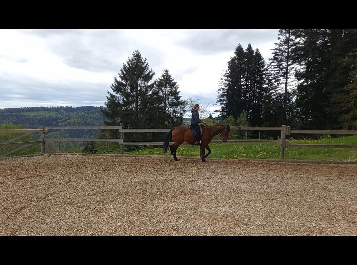 Nach ihrer Übernahme habe ich sie auf professioneller Ebene auf Parelli umgeschult und für guten, regelmässigen Muskelaufbau ein Jahr lang Bodenarbeit gemacht. Mittlerweile kann man sie ohne Probleme im Gelände sowie auch auf dem Platz reiten. Ihr Charakter ist eher gemütlich, also lieber Schritt anstatt Renngalopp, jedoch kann sie den