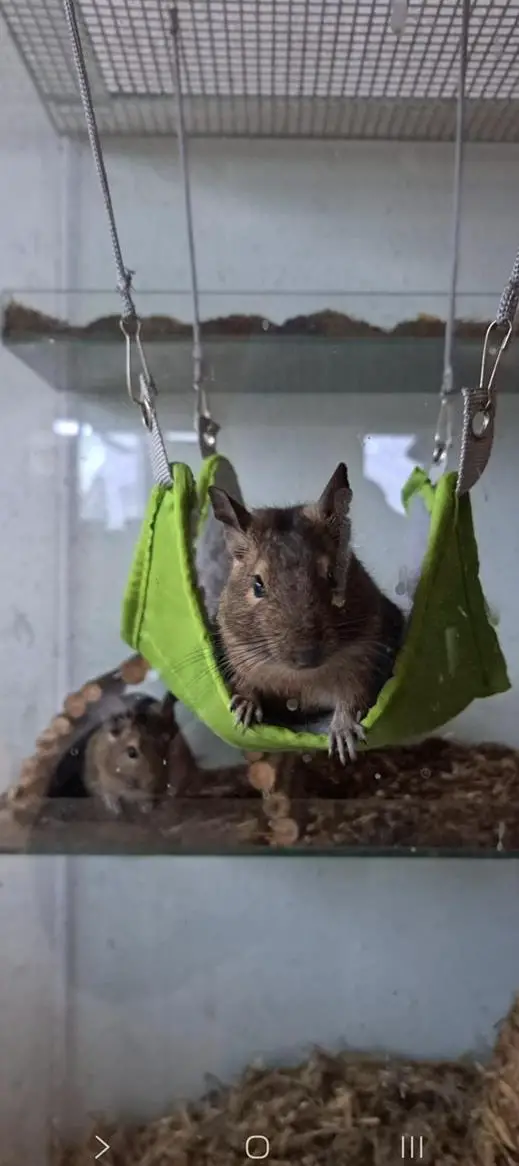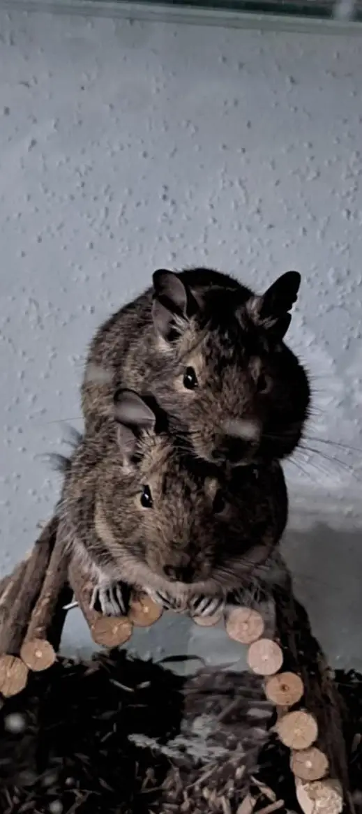 Es sind 4 Degu Brüder, welche ich in zweier Grüppchen abgebe, da sich alle 4 Degus zusammen nicht vertragen. Es geht den Degus besser in den zweier Grüppchen, so kommen sie auch gut zur Ruhe.
