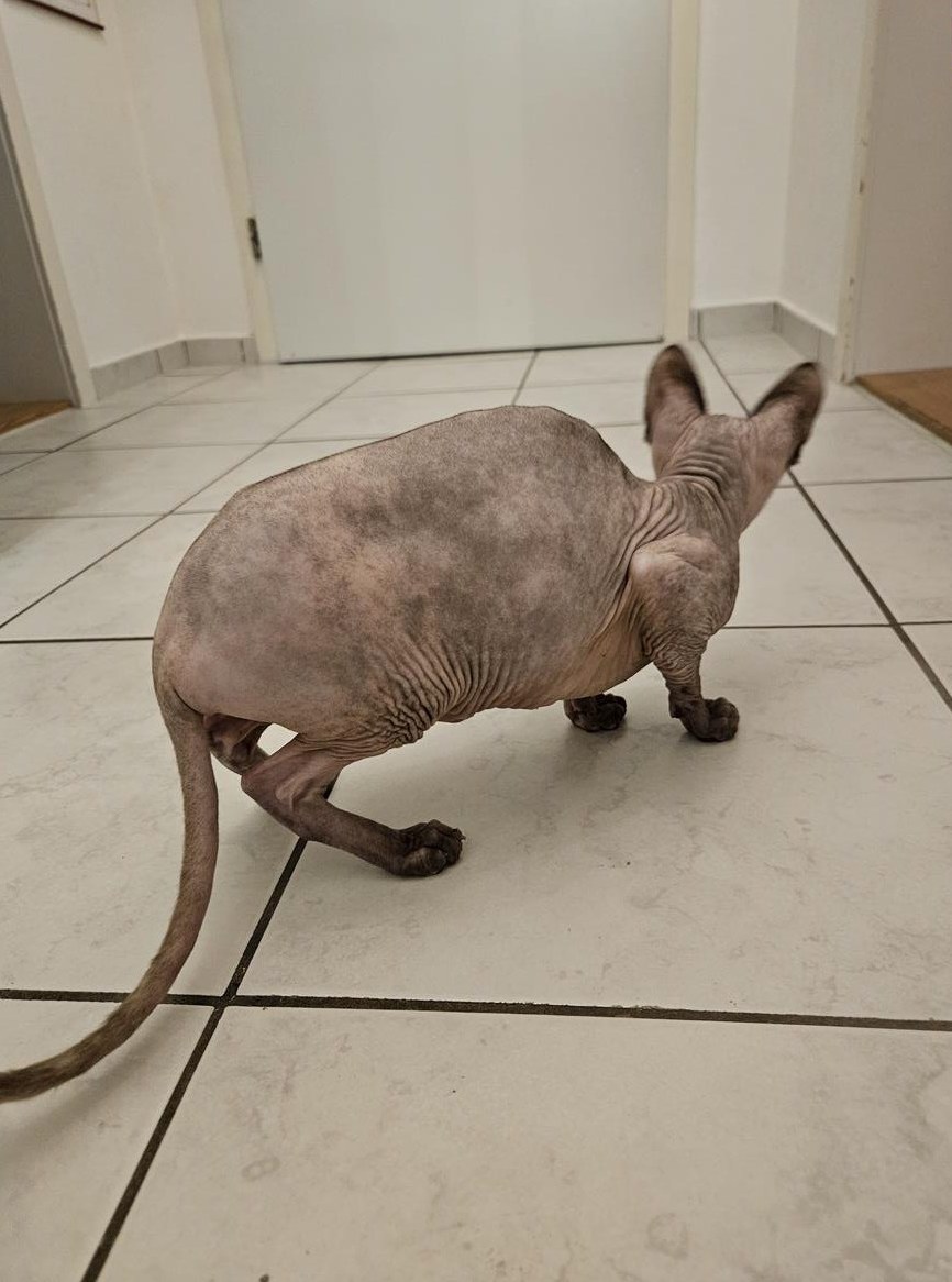 Die Sphynx Katze ist Hundeverträglich katzenverträglich. Sie hat durch einen Unfall leider ihr Auge verloren was komplett abgeheilt ist. Sie hat blaue Augen. Zudem leidet sie an chronischem Katzenschnupfen. Dieser kommt und geht mal stärker mal schwächer.
