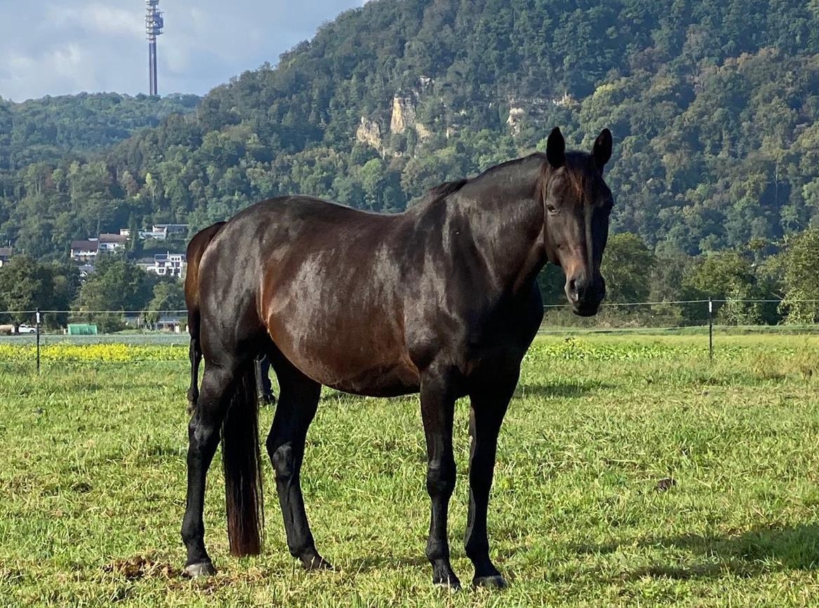 Aktuell steht die Hannoveraner Stute in einer grossen Herde in einem Aktivstall. Die Stute ist vorne beschlagen und hinten barhuf.
