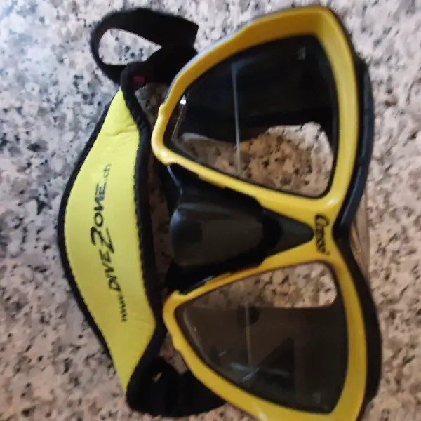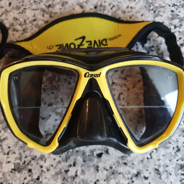 Glas schwarz mit korrigierten Gläsern Nähe der Marke "Cressi Big Eyes". Die Korrektur für die Nähe (Lesen des Computers / Finimeter/Notizen / Photografieren) wurde individuell angefertigt und beträgt Nähe R=-2.75 / Nähe L=-1.25 durch