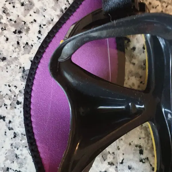Die Gesamtbreite der Maske (Glas) beträgt 180mm / Breite der Silikon Fassung 140mm. Kommt mit einem schicken Neoprenband in Lila/Neon und passender