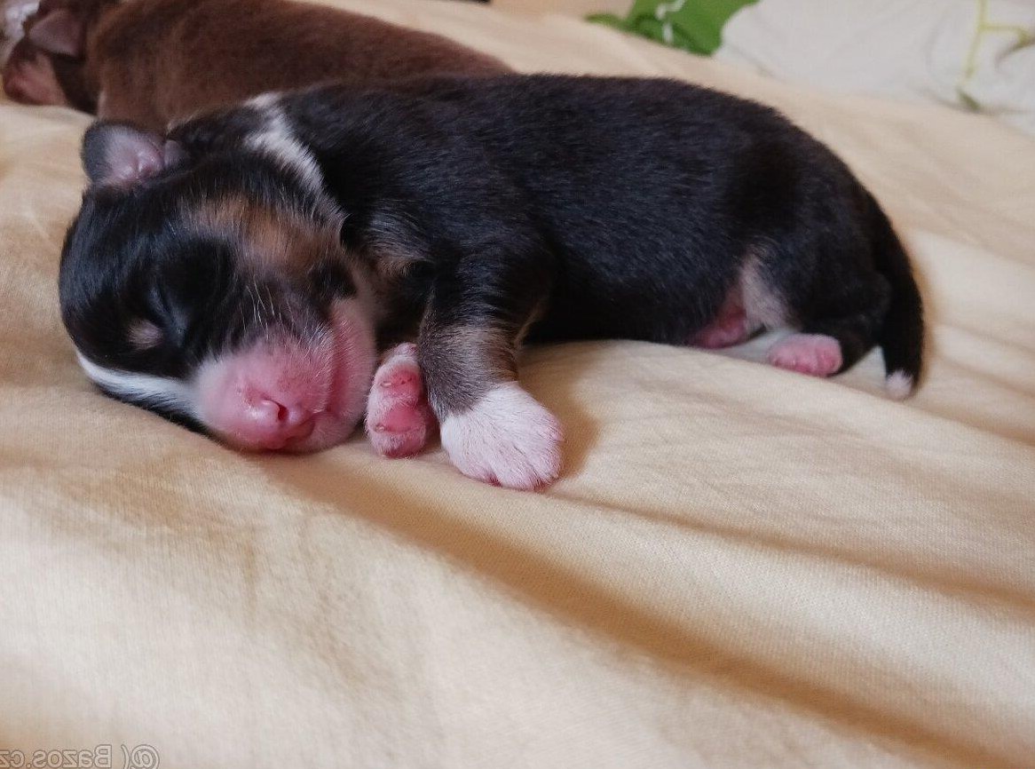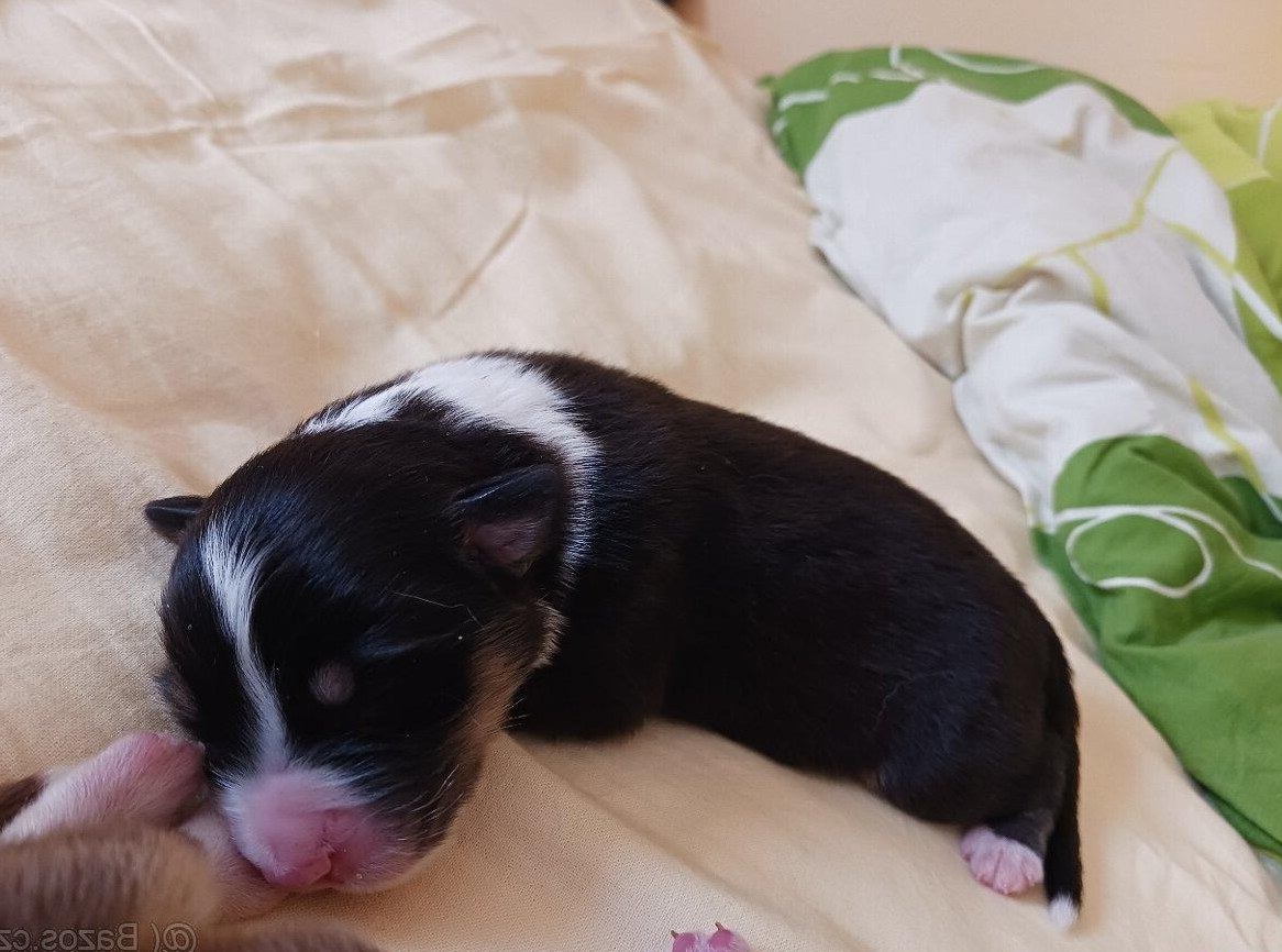 Der Australian Shepherd Welpe wurde mit einem langen Schwanz geboren. Beide
